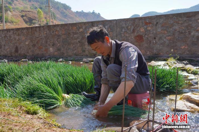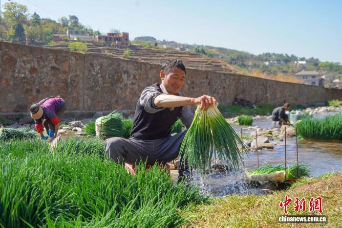 图为3月24日,威宁自制县哲觉镇瓦竹村小葱栽植基天,栽植户正在小河中洗濯刚刚采支的小葱。赵庆能 摄