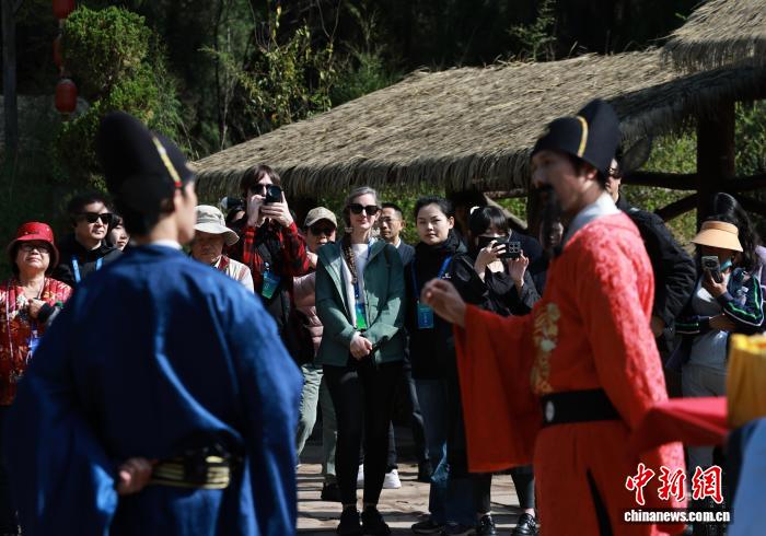 图为中好教者正在翠云廊旁观情形剧《面树接印》。中新社记者 王磊 摄